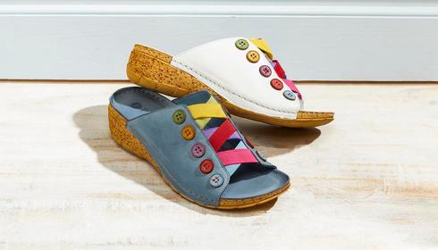 We’ve designed these sandals in an easy slip-on style with colourful buttons and elastic cross straps for a fun and flexible design.