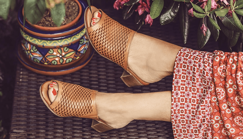 The heel of mules whether flat or high should be centered underneath the heel of your foot. Look out for a pair of mules with cushioned or contoured insoles as this will help your heels to sit comfortably into the mules and also absorb the impact of your step.